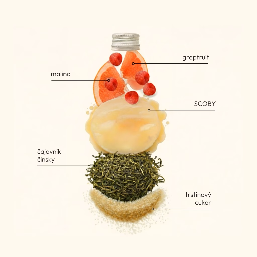 Grapefruit & malina (330ml) je nealkoholický fermentovaný nápoj novej generácie. Vyrába sa fermentáciou zeleného čaju a dochucuje sa iba skutočným grepom a malinami.