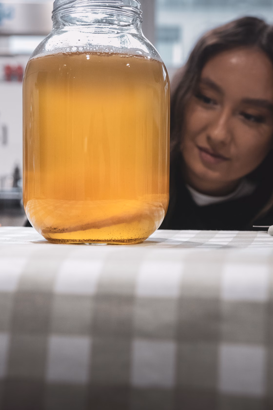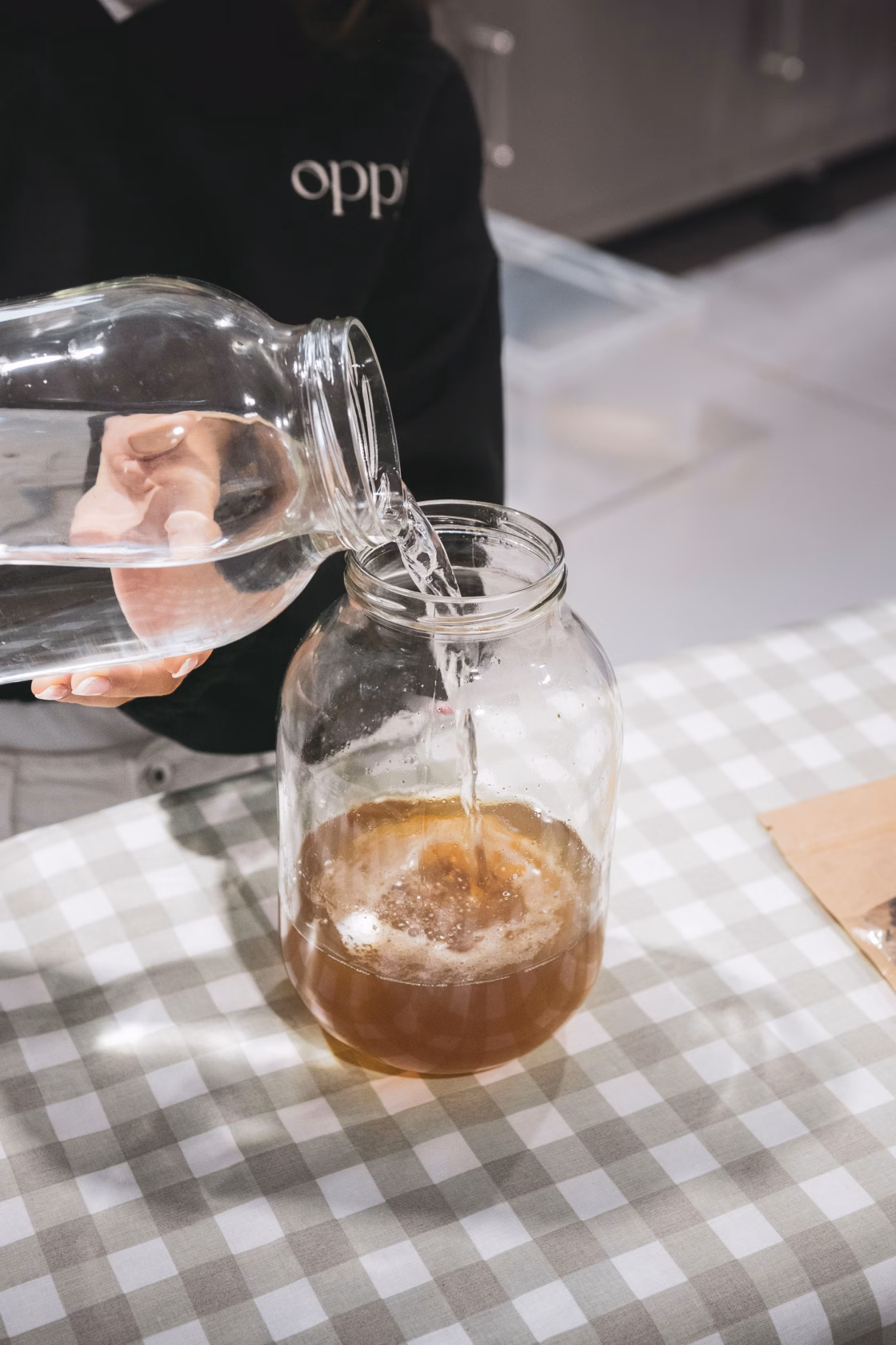 Cukor je energia, ktorá spustí fermentáciu – vďaka nemu sa tvoj čaj premení na niečo živé.Nechaj vychladnúť a vlož kultúru SCOBY spolu s trochou štartovacej kombuchy. Tu sa začína mágia – mikroskopický svet baktérií a kvasiniek sa prebúdza k životu..